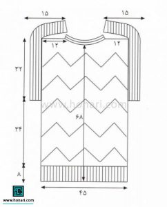 برای قسمت سجاف و لبه آستین، از هر دو طرف ۱۶ دانه اضافه کنید و با روش بافت یک رو، یک زیر ادامه دهید. وقتی قد کار به ۶۸ سانتیمتر رسید، ۳۲ دانه از وسط را ببندید. در رجهای بعدی، از هر طرف ۶ بار و سپس ۸ بار دیگر، دانهها را کم کنید. زمانی که قد بافت به ۷۴ سانتیمتر رسید، دانههای سرشانه را به جز ۱۶ دانه (که با الگوی یک زیر، یک رو بافته میشوند) ببندید. حالا این ۱۶ دانه را به صورت پلکانی کار کنید: ابتدا ۲ دانه ببافید و برگردید، سپس ۴ دانه ببافید و برگردید، بعد ۶ دانه و همینطور ادامه دهید تا همه ۱۶ دانه تمام شود. بعد از این مرحله، در هر بار برگشت از کنار سرشانه، یک دانه جدید بگیرید و نوار بافت را به سرشانه متصل کنید.