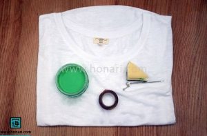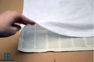 ابتدا، داخل تی‌شرت را با روزنامه یا مقوا پر می‌کنیم. این کار کمک می‌کند تا رنگ به قسمت‌های دیگر لباس نفوذ نکند.