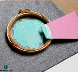 حالا می‌توانید کارگاه را روی هر قسمتی از لباس که دوست دارید، بگذارید. سپس کمی رنگ داخل طرح بریزید. یادتان باشد که مقدار رنگ با اندازه‌ی طرح هماهنگ باشد؛ نه خیلی زیاد، نه خیلی کم.