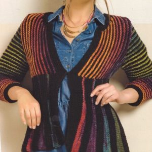 آستین: با نخ مشکی ۳۶ دانه سر میاندازیم و سه رج رکن میبافیم. سپس با نخ اسپورت یک رج و بعد با نخ مشکی یک رج دیگر رکن میبافیم. در هر ۶۰ رج که رنگبندی میکنیم، از دو طرف یک دانه اضافه میکنیم. وقتی قد کار به ۳۰ سانتیمتر رسید، برای قسمت حلقه آستین، ابتدا ۳ دانه، سپس ۲ دانه و بعد ۱ دانه را میبندیم. در هر ۶۰ رج رنگبندی، از دو طرف یک دانه کم میکنیم. وقتی ۸ دانه باقی ماند، همه را میبندیم.