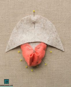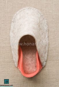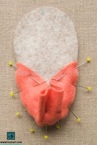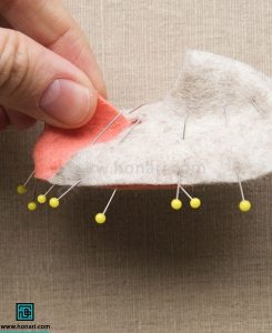 یک تکه از پشت کفش نمدی را با کمک سوزن، طوری که در تصویر می‌بینید، به کف آن وصل می‌کنیم.