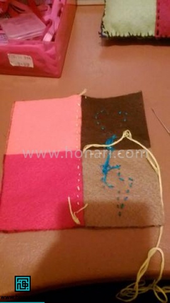 بعد از اینکه تزئینات کوسن نمدی را وصل کردید، قطعات اصلی رویه کوسن را روی هم قرار دهید و با دوخت بخیه به یکدیگر متصل کنید.