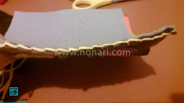 قطعههای نمدی برشخورده را در جای صحیح خود بگذارید و با کمک سوزن تهگرد محکم کنید. سپس آنها را به خوبی بدوزید.