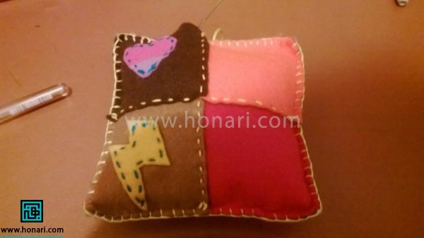 بعد از اینکه تزئینات کوسن نمدی را وصل کردید، قطعات اصلی رویه کوسن را روی هم قرار دهید و با دوخت بخیه به یکدیگر متصل کنید.