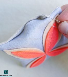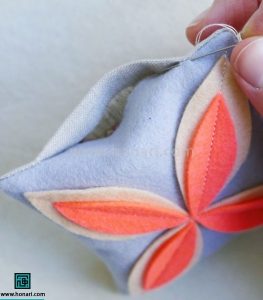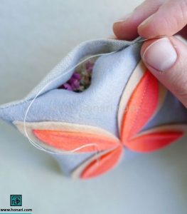 آن را به حالت اول برمیگردانیم. سپس داخل آن را با گیاهان خوشبویی که دوست داریم پر کرده و شروع به دوختن میکنیم.