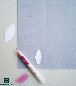 برای درست کردن کوسن، اول روی نمد دو مربع به اندازهی مورد نظرتان بکشید. برای تزیین این مربعها، از یک الگوی گل با چهار گلبرگ بزرگ و چهار گلبرگ کوچک استفاده کنید.