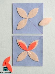 قطرههای مربعی شکل را با گلبرگهای بزرگ میپوشانیم و بعد، گلبرگهای کوچکتر را روی آنها قرار میدهیم.