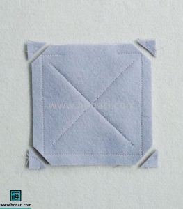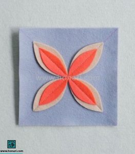 طرح روی کوسن که با نمد دوخته شده آماده است. حالا آن را با کمک سوزن به قطعه مربع شکل دیگری وصل میکنیم و لبههای آن را – به جز یک طرف – میدوزیم.