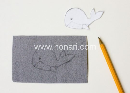 اول، یک تکه نمد به رنگ طوسی بردارید. بعد، الگوی نهنگ آبی که در این آموزش وجود دارد را روی کاغذ الگو بکشید. سپس، الگو را با قیچی به دقت جدا کنید. در آخر، الگو را روی سطح نمد قرار داده و آن را منتقل کنید.