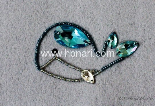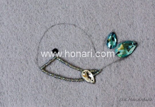 حالا، نگین درشت و شفاف را با کمک نخ خاکستری پررنگ، به بخش بالایی پشت نهنگ وصل کنید. سپس، داخل حفره‌های این نگین کریستالی، دانه‌های مروارید ریز را بدوزید.