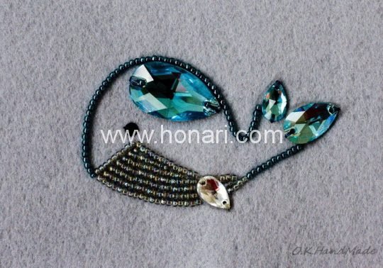 مهره‌های آبی رنگ را به صورت پراکنده و نامنظم، و در کنار یکدیگر، روی کار بدوزید.