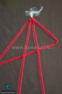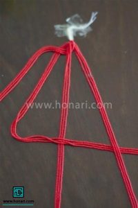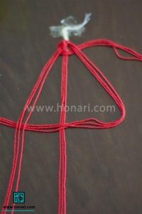 در مرحله بعد، نخستین رشتهای که از سمت چپ قرار دارد را به صورت از رو و زیر، از بین رشتههای کناری خارج میکنیم.