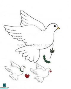 مراحل کار بسیار ساده است. ابتدا الگوی داده شده را روی کاغذ بکشید و سپس آن را برش بزنید. بعد، کاغذ الگو را روی پارچه نمدی قرار داده و دور آن را خط بکشید. در پایان، با قیچی، شکل کبوتر را از نمد جدا کنید.
