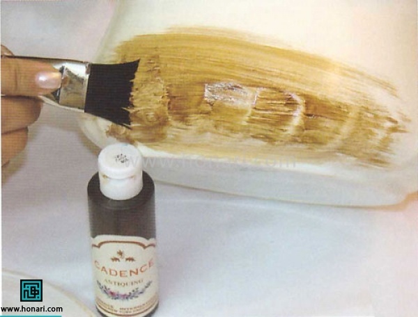 در ابتدا، روی سطح ظروف چینی را با رنگ مخصوصی به نام انامل میپوشانیم. سپس، ظروف را به مدت نیم ساعت داخل فر قرار میدهیم. دمای فر باید روی ۱۳۰ درجه تنظیم شود تا رنگ کاملاً بر روی ظرف ثابت و محکم شود. پس از این مرحله، مادهای به نام آنتیکینگ را با استفاده از یک قلمو به آرامی روی سطح کار میکشیم.