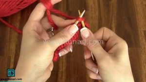 – برای دانههای زوج (مثل دانه دوم، چهارم، ششم و …) میل را همانطور که در تصویر مشاهده میکنید، از پشت وارد دانه کنید و سپس آن را ببافید.