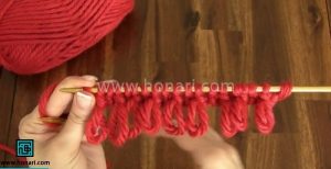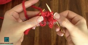 – دانه اول را معمولی ببافید (توجه کنید که این کار فقط در رج اول انجام میشود و در رجهای بعدی، دانه اول را بدون بافتن به میل دیگر منتقل میکنیم).