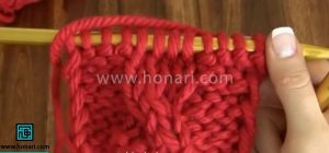 برای بافت، طوری عمل کنید که دانههای مربوط به قسمت پیچ در زیر کار قرار بگیرند و دانههای سمت چپ و راست آن به رو بافت شوند.