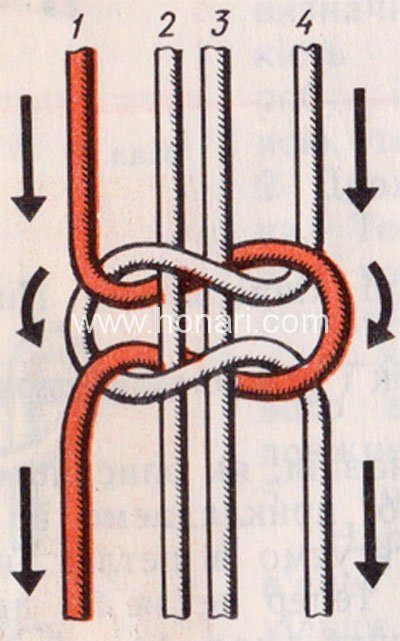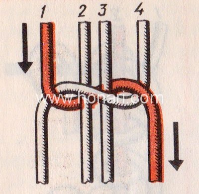نخ سمت چپ را از زیر دو نخ میانی رد کرده و سپس از روی نخ سمت راست عبور دهید.
