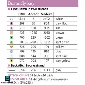 این طرح یک نمونه زیبا از هنر سنتی است که در آن با استفاده از نخ و سوزن، نقشهای گل و پروانه بر روی پارچه ایجاد میشود. هر بخش از طرح با شمارههای مشخصی علامتگذاری شده است که نشان میدهد از چه رنگی و در کجا استفاده شود.