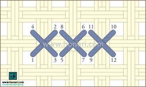 روش دوخت به این صورت است که از نوع ساده و رایجِ ضربدری استفاده میشود. در این روش، نخ در یک ردیف به صورت رفت کار میشود و سپس در ردیف بعد، به صورت برگشت دوخته میشود تا در نهایت، نقشِ ضربدریِ کامل و مرتبی ایجاد شود.