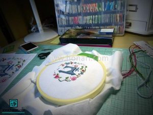 بعد از اتمام دوخت گلهای اطراف، حالا نوبت به دوختن گل اصلی روی چرخ خیاطی میرسد. دیگر شمارهدوزی به پایان خود نزدیک شده و کار در آستانه تمام شدن است.