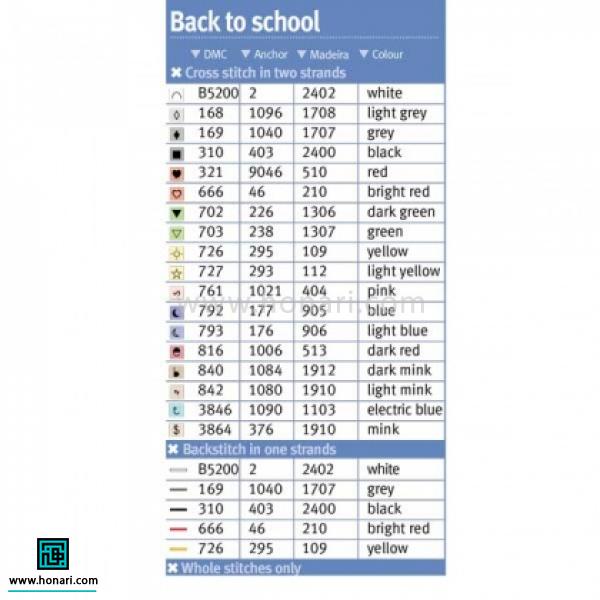 در هر نقشه، رنگهای مختلف با استفاده از حروف انگلیسی یا نشانههای خاصی از هم جدا شدهاند. در قسمت پایین نقشه نیز یک راهنما وجود دارد که در آن، هر رنگ یا علامت به شمارهی نخ مخصوص خود وصل شده است. این راهنما دقیقاً مانند تصویری است که در ادامه میبینید.